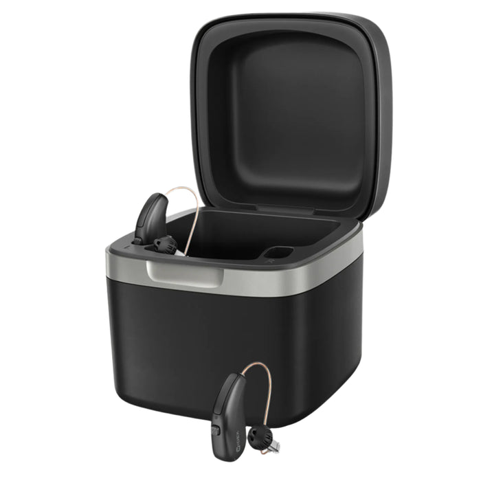 Take better care of your Widex Allure rechargeable hearing aids with Widex Allure Charge N Clean charger. The drying process uses a UV-C LED treatment and kills 99.99% of bacteria, yeast and viruses off your Widex Allure hearing aids. The combination of automatic sanitization and drying keeps your hearing aids working better and longer.